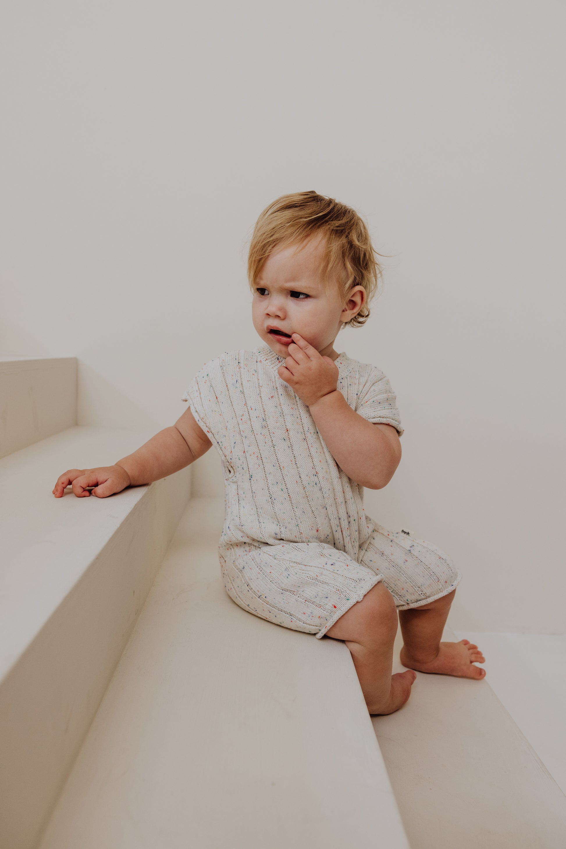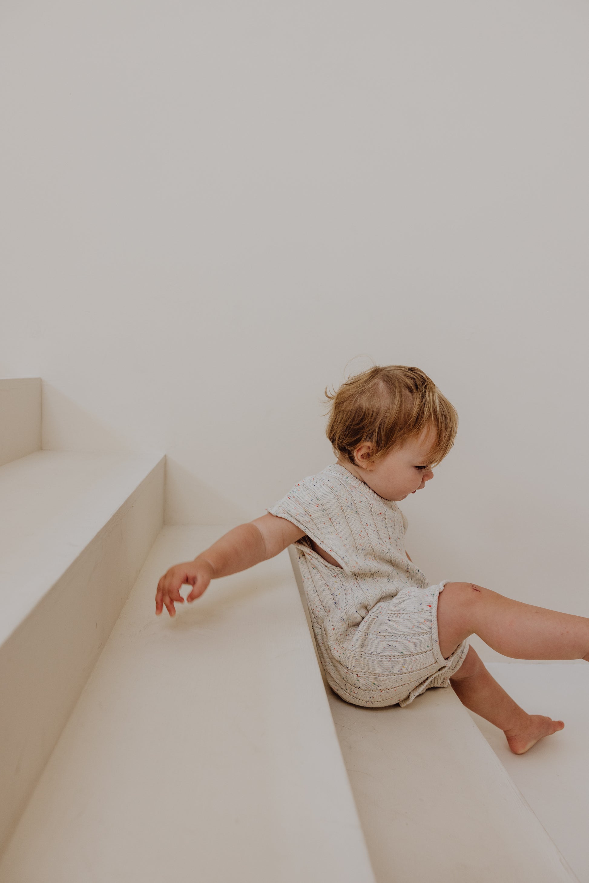 Mit seinem zeitlosen Design, feinen Farbsprenkel-Details und praktischen Druckknöpfen im Schritt ist dieser Overall nicht nur ein Hingucker, sondern auch besonders funktional. Der Rundhalsausschnitt mit Knopfverschluss erleichtert das An- und Ausziehen – ideal für den Alltag mit Baby.