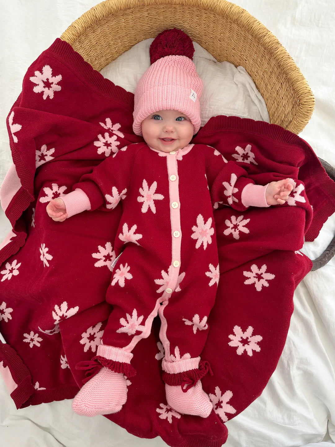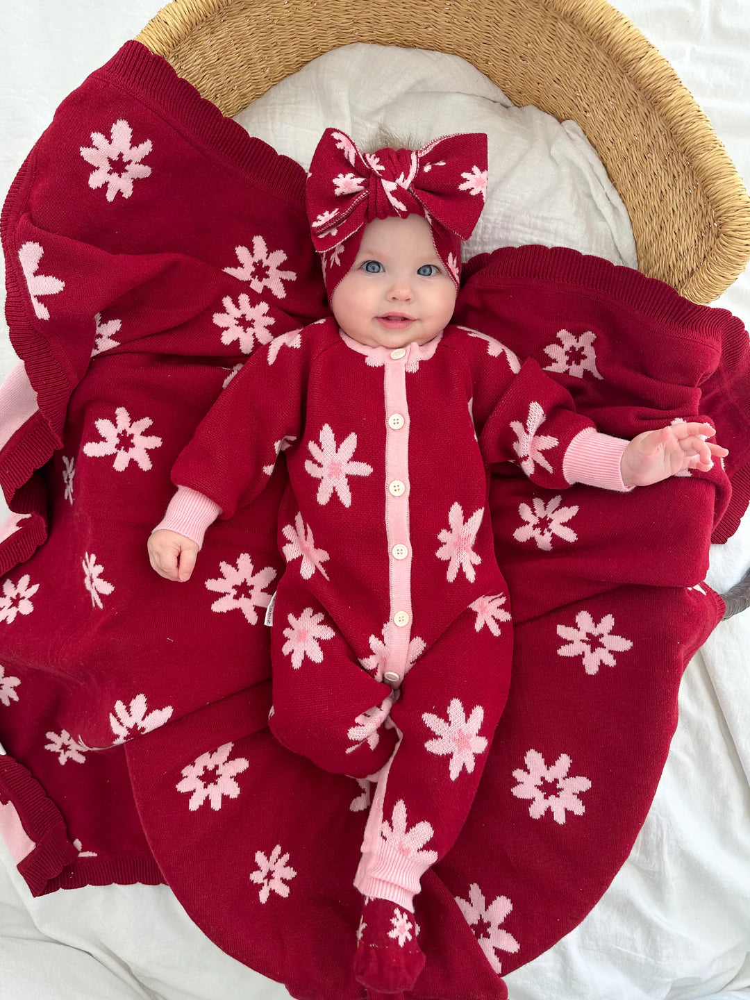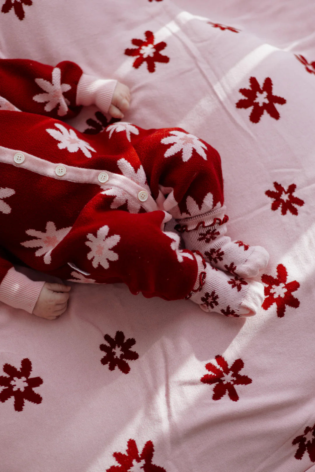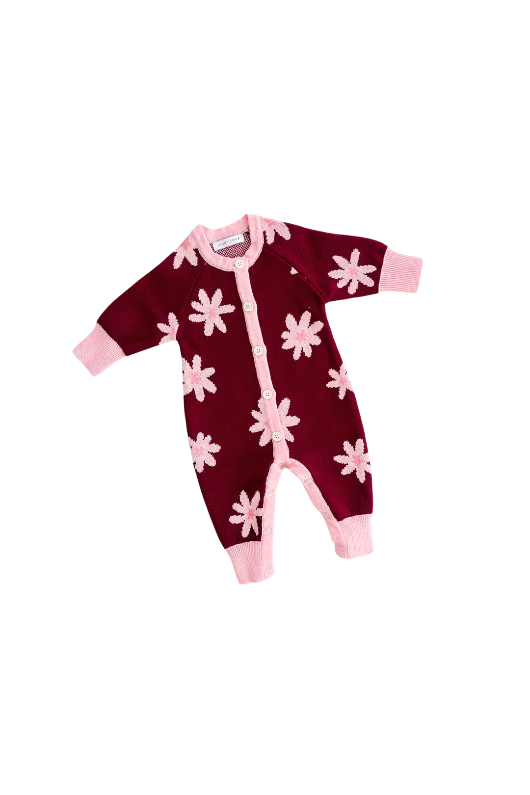 Ein wunderschöner Jacquard-Strickromper mit unserem Lola-Design. Funktionale Knöpfe auf der Vorderseite und Druckknöpfe im Schritt für einfaches Windelwechseln und An- bzw. Ausziehen.