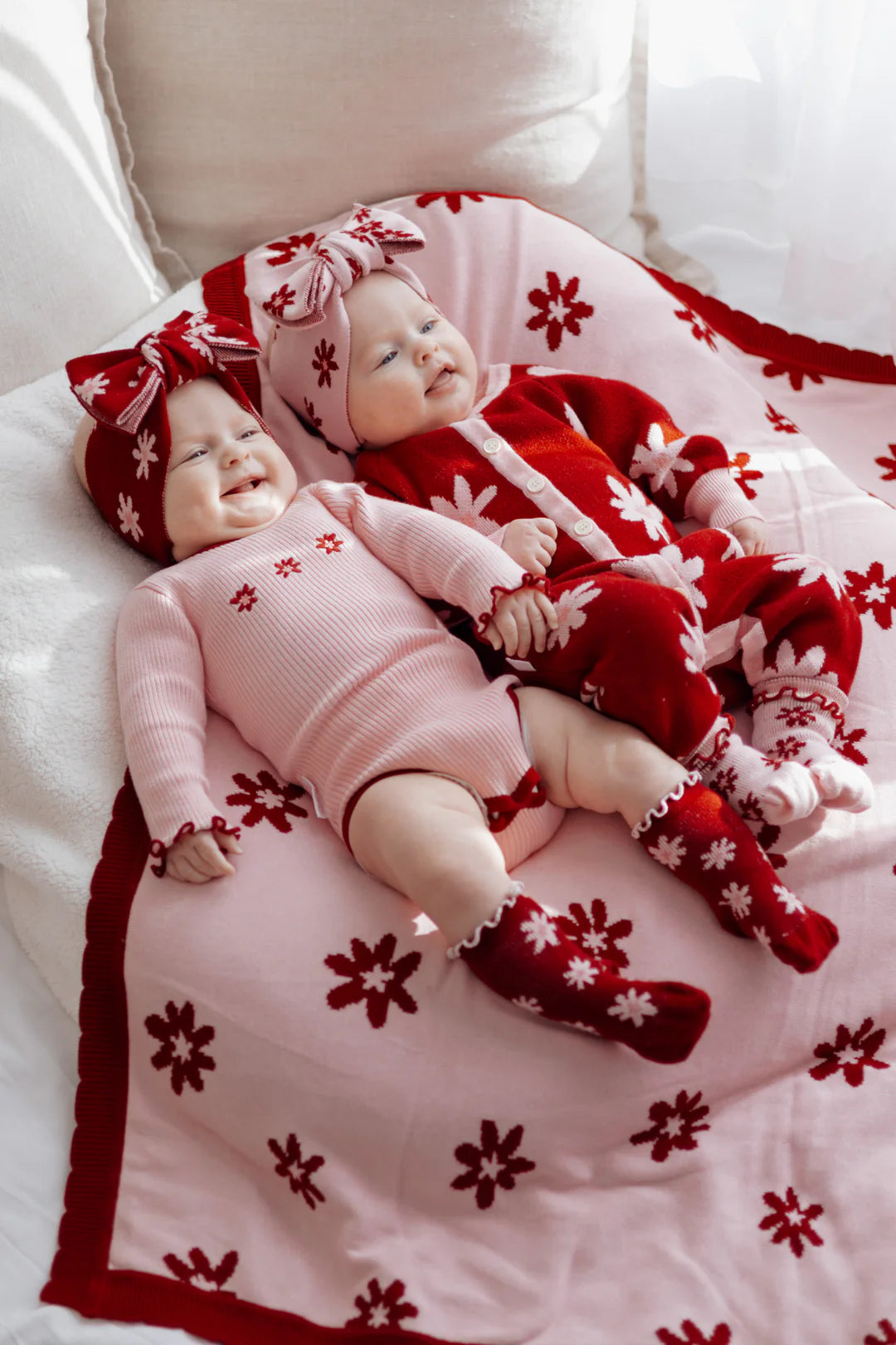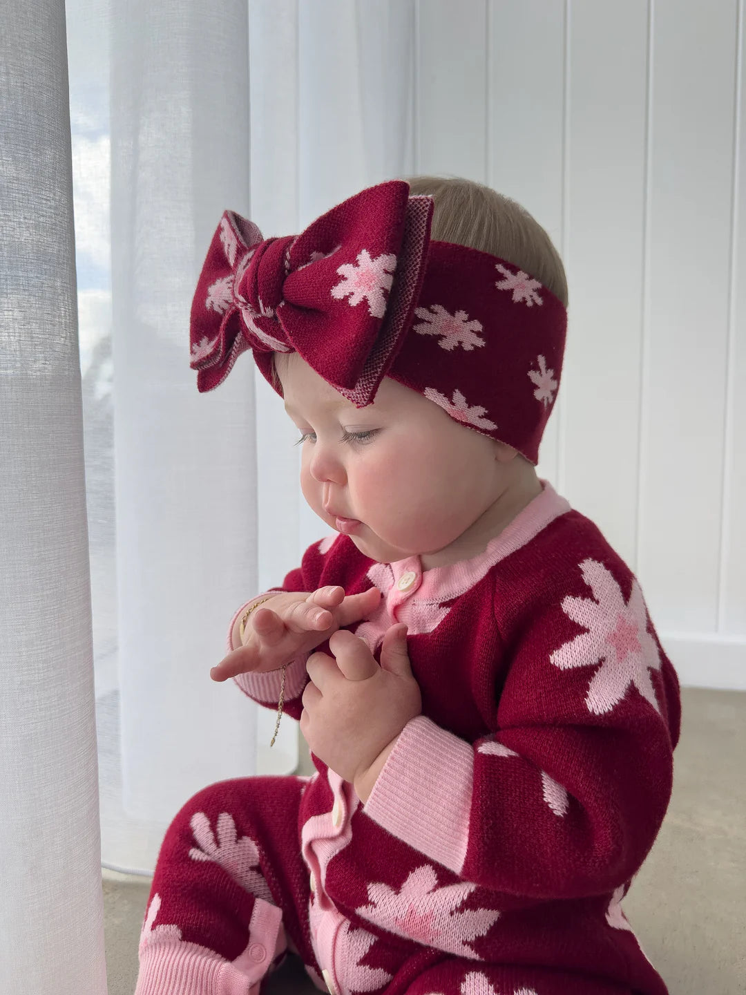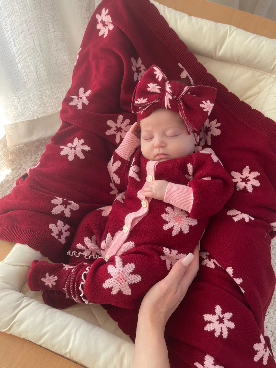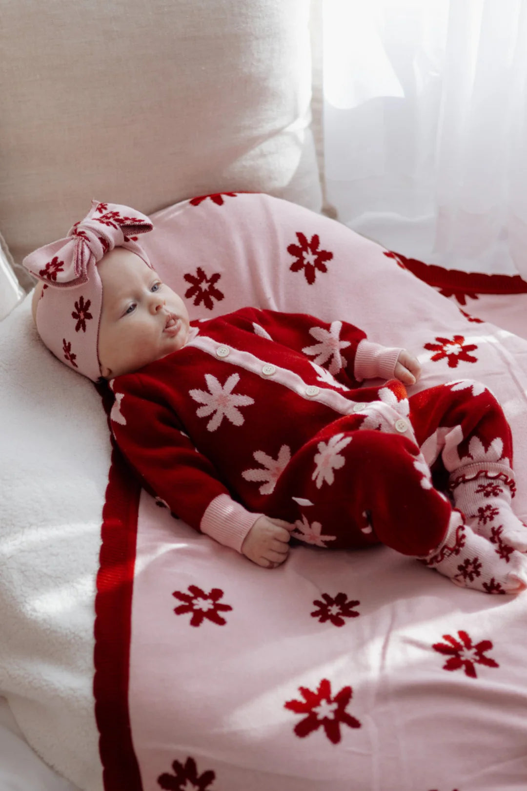 Ein wunderschöner Jacquard-Strickromper mit unserem Lola-Design. Funktionale Knöpfe auf der Vorderseite und Druckknöpfe im Schritt für einfaches Windelwechseln und An- bzw. Ausziehen.