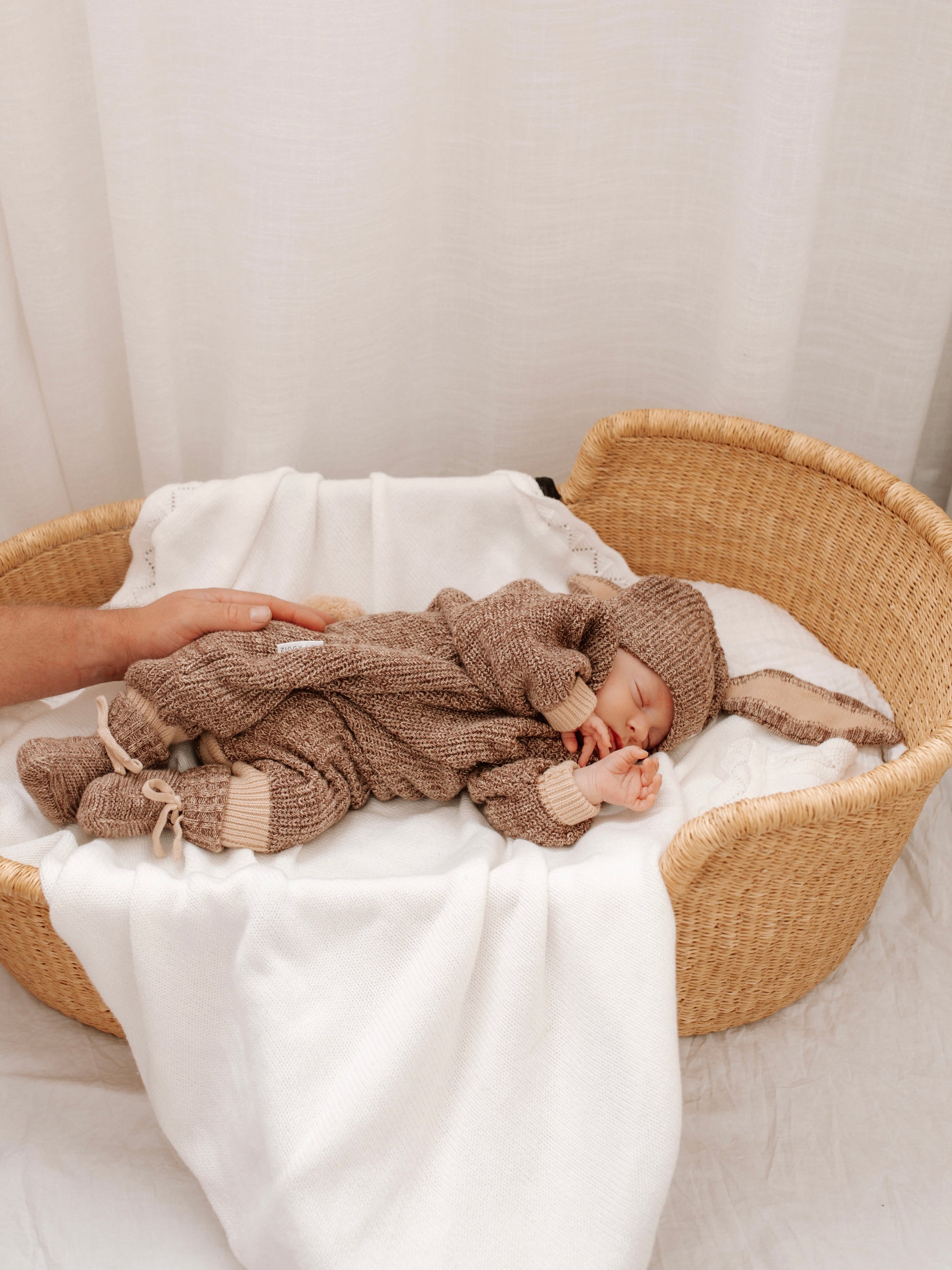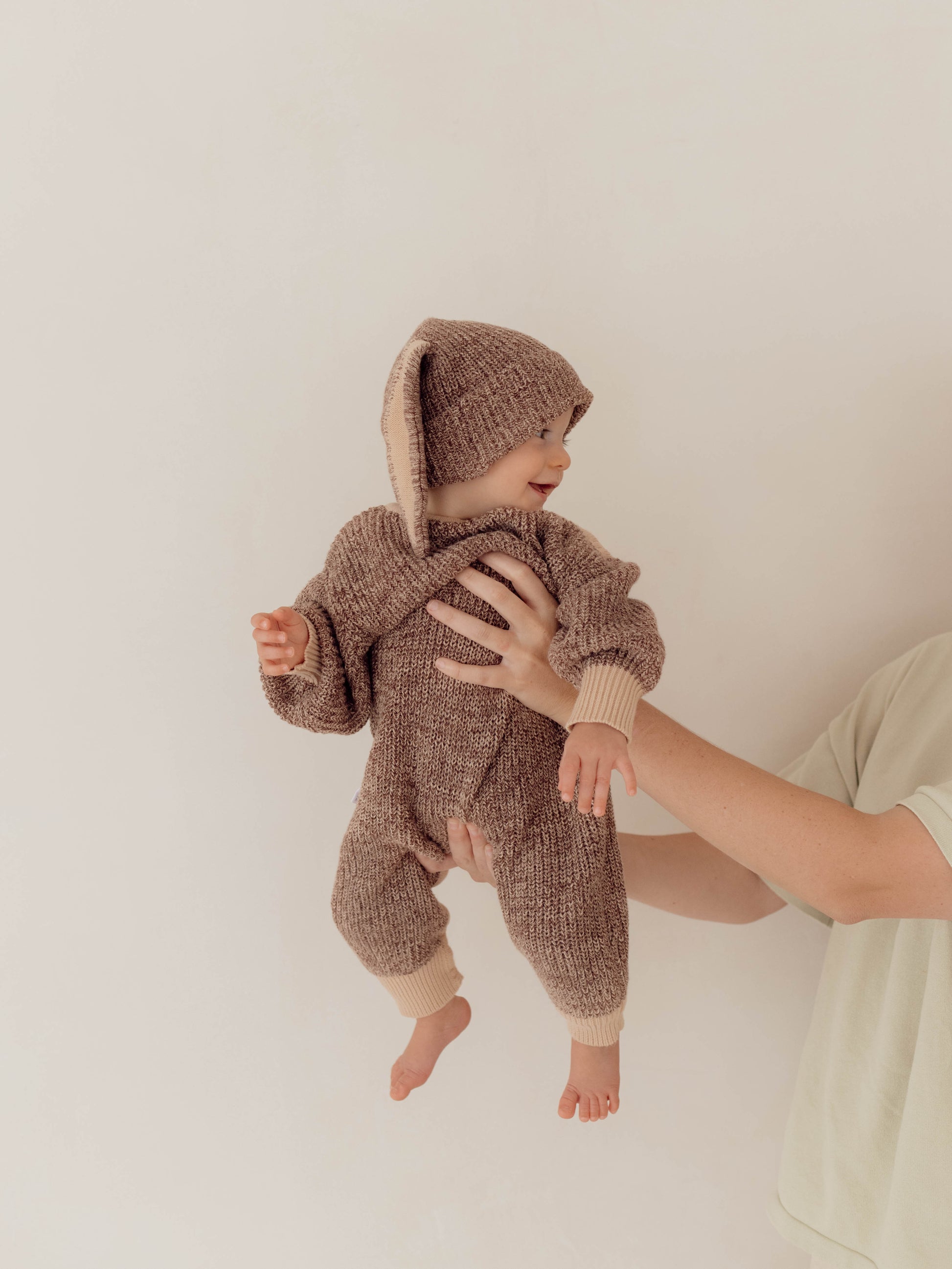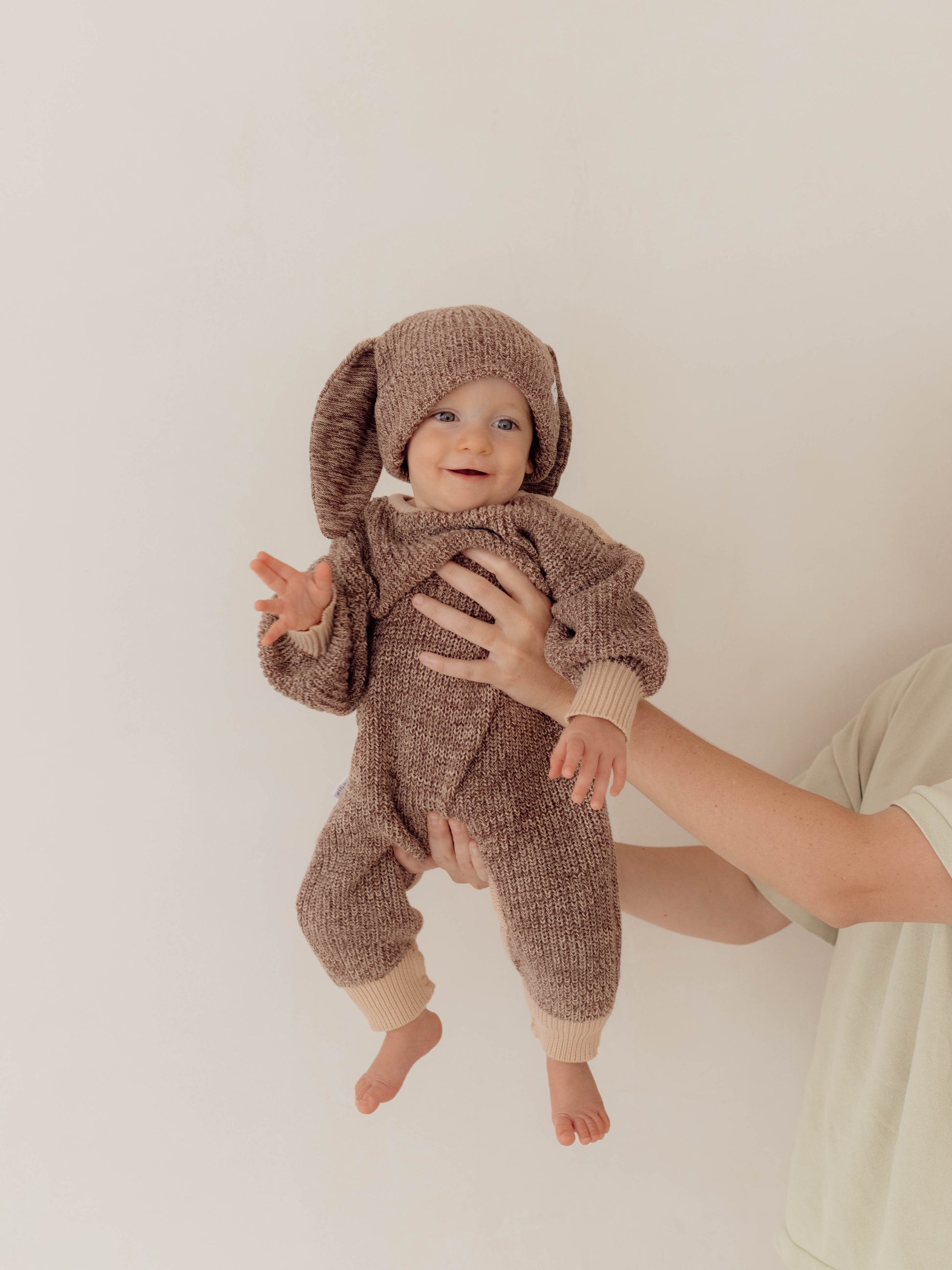 Unser kuscheliger Strickromper aus 100 % Bio-Baumwolle ist das perfekte Outfit für kleine Entdecker! Mit liebevollen Details wie der süßen Hasenohren Mütze und einem flauschigen, abnehmbaren Bommel als Schwänzchen sorgt er für maximalen Komfort und einen bezaubernden Look. Das atmungsaktive, weiche Material ist sanft zur empfindlichen Babyhaut und ideal für jede Jahreszeit. Mit praktischen Druckknöpfen am Schritt für den schnellen Windelwechsel. Perfekt als Geschenk zur Geburt, für Fotoshootings oder einfach zum Wohlfühlen.