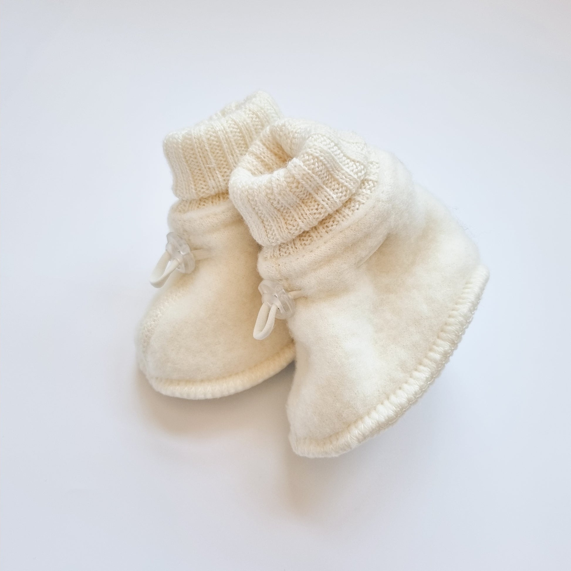 Babyschuhe aus Merinowolle, hergestellt aus superweichen gebürsteten Merinowoll-Obermaterial, bieten Wärme und Schutz, wenn sie draußen den Elementen ausgesetzt sind. Sie können auch drinnen getragen werden, um Babys Füße warm und kuschelig zu halten. Passend zu unserem Baby-Einteiler aus Wolle.
